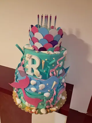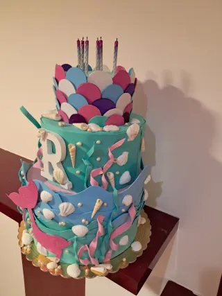 Torta a tema sirenetta a tre piani, perfetta per una festa speciale. - Decorazioni a tema marino con conchiglie e sirena. - Colori vivaci e scintillanti. - Include candeline.