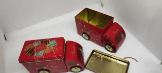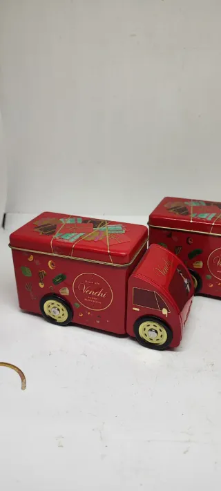 Set di due furgoncini in latta Venchi, perfetti come contenitori decorativi. - Design a forma di camioncino. - Colore rosso vivace. - Decorazioni a tema. - Ottime condizioni.