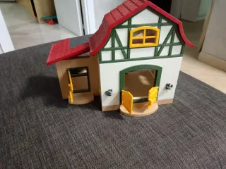 Fattoria Playmobil con tetto rosso e dettagli verdi. - Struttura principale bianca con finiture verdi. - Porta gialla sul lato sinistro. - Doppia porta gialla sul fronte.