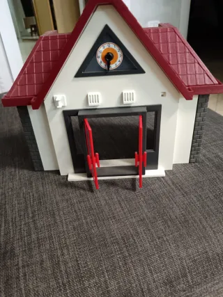 Edificio scolastico Playmobil con tetto rosso e porte rosse. - Orologio sul frontone. - Finestre bianche. - Dettagli in mattoni grigi.