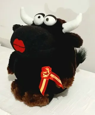 Simpatico peluche a forma di toro spagnolo, perfetto per collezionisti o come idea regalo. - Morbido tessuto nero. - Dettagli rossi sulle labbra e fiocco decorativo. - Corna bianche.