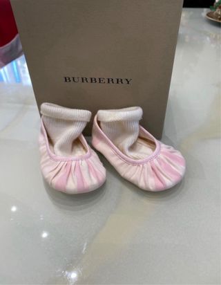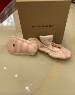 Deliziose scarpine per neonata da culla. - Colore rosa e bianco. - Design a ballerina con calzino integrato. - Logo Burberry visibile sulla scatola.
