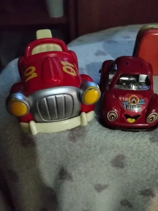 Set di due giocattoli vintage a forma di auto. - Un'auto dei pompieri rossa con dettagli gialli e grigi. - Un'altra auto rossa con dettagli che richiamano i pompieri.313 paperino vendo zona Asti
