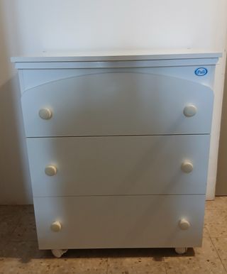 Pratico fasciatoio Pali con tre ampi cassetti per riporre tutto il necessario per il cambio del bambino. Con inserto per bagnetto rimovibile fuori ha un piccolo punto in cui è venuta via vernice come si vede da foto e all'interno ha una lieve riga in un cassetto e una piccola e lieve riga nella parte interna del coperchio. inoltre manca il freno a una ruota. misure: 75.5x45 cm altezza 88.5 cm