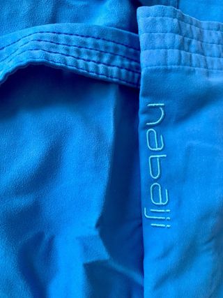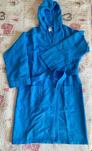 Accappatoio con cappuccio, taglia 14 anni. - Colore blu vivace. - Due tasche frontali. - Cintura in vita. - Logo Nabaiji sul braccio sinistro.
