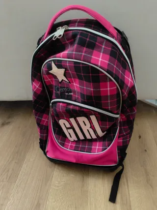 Zaino per la scuola con un vivace motivo a quadri rosa e neri, ideale per le ragazze. Presenta una stella glitterata e la scritta GIRL sul davanti. - Fantasia a quadri rosa e neri. - Stella glitterata applicata. - Scritta GIRL in rilievo. - Dettagli in fucsia.