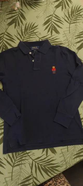 Maglia polo a maniche lunghe firmata Ralph Lauren, taglia 10/12 anni. Il capo è di colore blu scuro e presenta l'iconico orsetto ricamato sul petto. - Colore: Blu scuro - Taglia: 10/12 anni - Logo: Orsetto ricamato