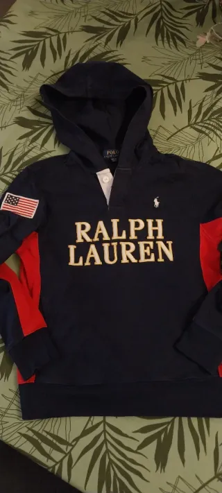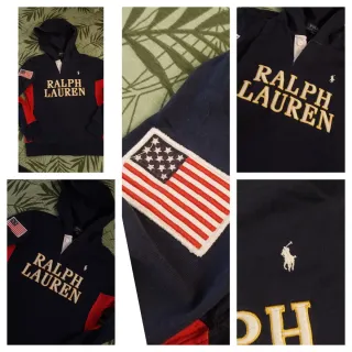Felpa leggera Ralph Lauren con dettagli a tema bandiera americana. - Colore blu navy. - Inserti rossi sulle maniche. - Patch bandiera USA. - Logo Ralph Lauren ricamato.