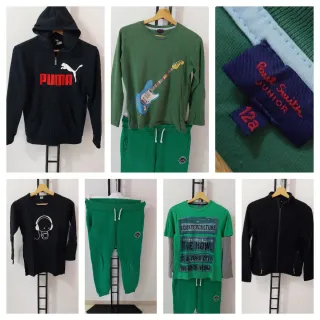 Lotto composto da sei capi di abbigliamento per bambino 10/12anni - Felpa con cappuccio nera Puma. - T-shirt verde a maniche lunghe con stampa chitarra Paul Smith - Pantaloni della tuta verdi shoe. - T-shirt nera a maniche lunghe con stampa. - Giacca/felpa nera con zip quechua quechua - T-shirt verde maniche lunghe ovs