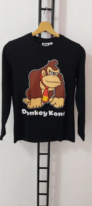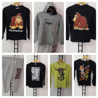 lotto composto da 6 capi di abbigliamento per bambino. - T-shirt nera maniche lunghe con stampa Donkey Kong - Felpa grigia con cappuccio Puma - Pantaloni grigi con stampa Harvard H&M - T-shirt nera con stampa Industry Iron City - T-shirt verde lime con stampa cervo