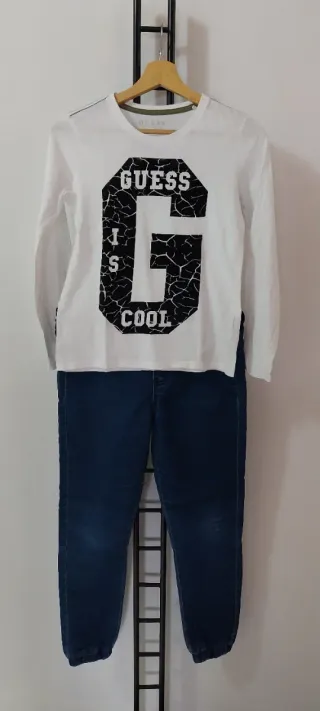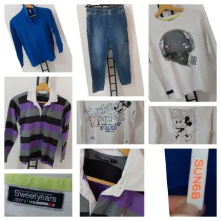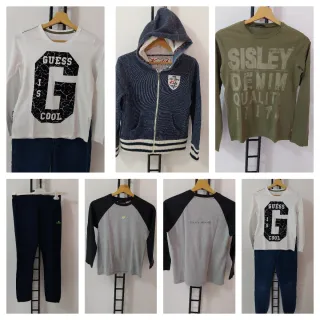 Lotto composto da 6 capi di abbigliamento per bambino 10/12anni. - Taglia 10/12 anni. - Include magliette, felpa e pantaloni. -T-shirt maniche lunghe Guess Guess -T-shirt maniche lunghe Dkny Dkny - T-shirt maniche lunghe Sisley - tuta mek - jeans lee coper buone condizioni - Varie marche e stili.