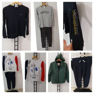 Set abbigliamento 7 pezzi - Smanicato imbottito blu con zip lime UnitedcolorsofBenetton. - Maglia a maniche lunghe blu con stampa ADRENALINE. - Pantaloni della tuta blu decathlon - pigiamo azzurro con stampa LONGBOARD,pantaloni fantasia scozzese blu. - Maglia a maniche lunghe bordeaux con stampa GYMNASIUM WILD TIGERS. - Pantaloni della tuta blu con dettagli grigi champiion .