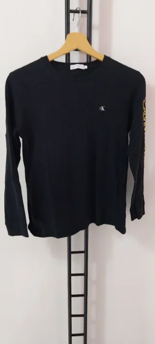 Lotto di sei capi di abbigliamento per bambino. - T-shirt a maniche lunghe nera con logo Calvin Klein - Pigiama maniche lunghe + pantaloni grigia H&M - T-shirt a maniche lunghe bianca con stampa vela e maniche rosse. - Giacca a vento verde con cappuccio Ovs. - Pantaloni di tuta blu scuro Ovs.