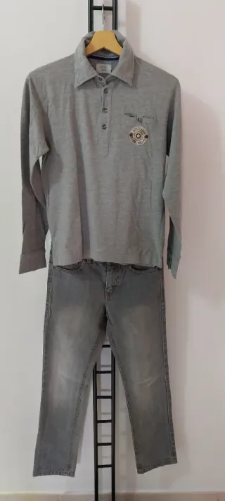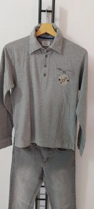 Set composto da maglia Liu Jo e jeans Kiabi. - Maglia grigia a maniche lunghe con colletto. - Jeans grigi.