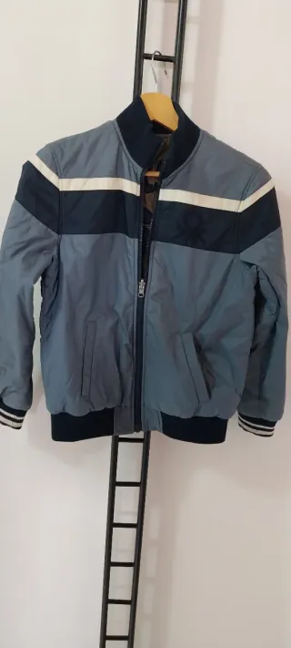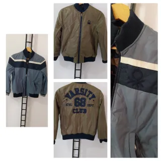 Giubbotto mezzo stagione Benetton reversibile, perfetto per ogni occasione. - Un lato color cachi militare con logo Benetton. - L'altro lato color grigio e blu con banda bianca e logo Benetton. - Collo alto a costine. - Chiusura con zip.