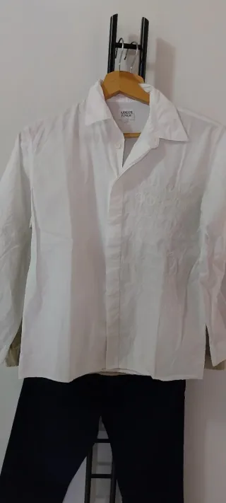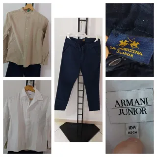 Set composto di 3 pezzi -camicia bianca 140cm Armani Junior - Pantaloni blu La Martina taglia 12anni ma va bene anche per 10anni. -camicia beige United colorsofBenetton con colletto alla coreana.