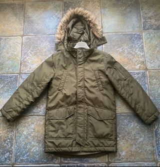 Caldo giubbotto per bambino con cappuccio bordato in pelliccia sintetica. - Colore verde militare. - Chiusura centrale con zip. - Tasche frontali. - Tasca sulla manica.