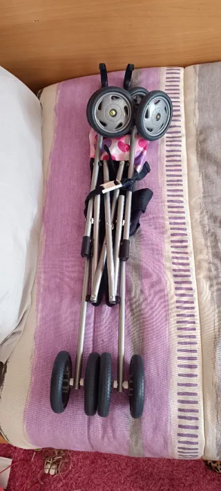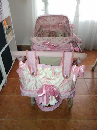 Passeggino per bambole di colore rosa con dettagli in marrone e blu. È pieghevole e facile da riporre. Design con disegni infantili. Struttura metallica. Ruote per facilitare il movimento. Ha solo una macchia sul vassoio inferiore. Manubrio reclinabile. In regalo copripiumino e cuscino abbinati.