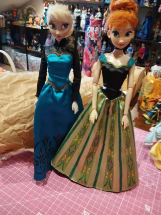 Set di due bambole dei film Frozen, Elsa e Anna. Vengono con i loro vestiti caratteristici. - Bambola Elsa con vestito blu e nero. - Bambola Anna con vestito verde e nero.