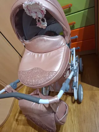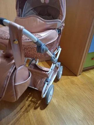 Carrello per bambole elegante in colore rosa metallizzato, con dettagli glitterati. Culla ampia e confortevole. Include borsa abbinata. Struttura resistente e ruote manovrabili.