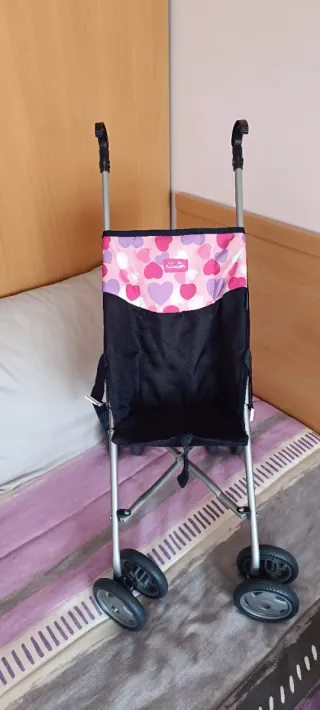 Sedia da passeggio per bambole con un divertente motivo a cuori. - Design pieghevole. - Struttura in metallo. - Doppie ruote.
