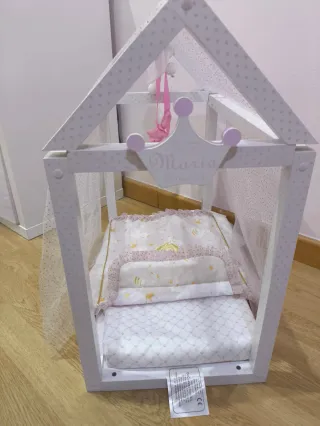 Culla bianca con design a casetta, ideale per bambole neonate reborn. Include un baldacchino in tulle bianco con piccoli riflessi e un set di biancheria da letto. Struttura in legno bianco. Baldacchino in tulle con dettagli brillanti. Biancheria da letto con stampa a stelle e un disegno centrale.