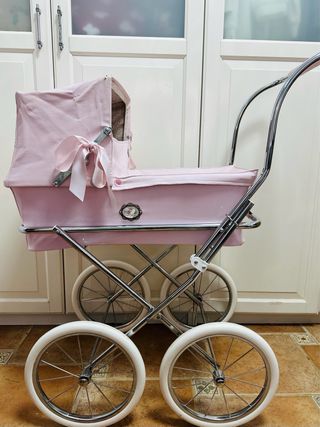 Passeggino per neonati in stile classico, ideale per bambole Reborn. Il suo design in rosa con dettagli in pizzo gli conferisce un tocco vintage. Ampio e imbottito, con ruote grandi e resistenti e struttura metallica cromata.