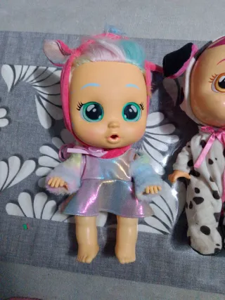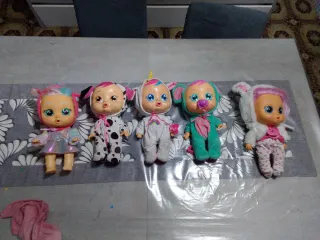 Lotto composto da 5 bambole Cry Babies piangenti, ognuna con un outfit unico. - Bambola con vestito iridescente e cappuccio con orecchie. - Bambola con tutina a pois bianchi e neri e cappuccio con orecchie da cane. - Bambola con tutina bianca e arcobaleno, cappuccio con orecchie da unicorno. - Bambola con tutina verde acqua e rosa, cappuccio con orecchie da elefante e ciuccio. - Bambola con cappuccio da coniglietto bianco e tutina rosa a pois.
