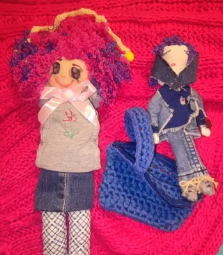 Due bambole artigianali uniche, perfette per collezionisti o come regalo. - Una bambola ha capelli ricci rosa e viola, con un vestito grigio e gonna di jeans. - L'altra bambola indossa abiti di jeans. - Include una borsa blu all'uncinetto.