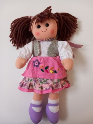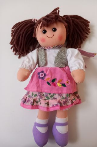 Bambola di pezza con capelli castani raccolti in due codini. Lunghezza cm.40 nuova con cartellino.