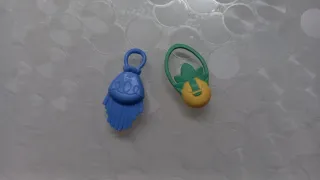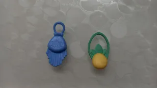Set di due borse x bambole - Un portachiavi blu a forma di sacchetto con nappe. - Un portachiavi giallo e verde a forma di ananas.