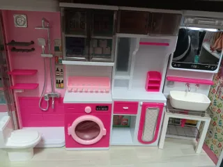 Set di mobili per la casa delle bambole Barbie, in vivace colore rosa. - Design dettagliato Suona e la luce dello specchio si accende Sui siti si trova a 19€ senza doccia e mobile asse da stiro Vendo il set completo NON INCLUDE ACCESSORI SOLO MOBILI