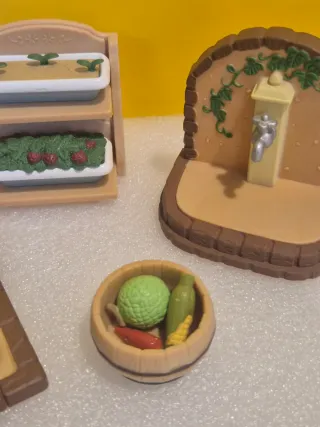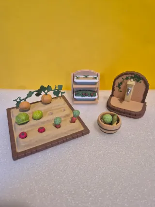 Set da giardino e orto per le case delle bambole Sylvanian Families. - Include un orto con verdure e fiori. - Comprende una fontanella. - Include una rastrelliera con vasi. - C'è anche un cesto con verdure.