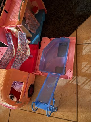 Autocaravana giocattolo Barbie, ideale per le avventure. Autocaravana barbie Mattel. Ha scivolo e piscina, cucina, letto, salone e bagno. Contiene un tavolo che, insieme alle sedie del conducente, si sposta per mangiare ovunque. Viene con gli accessori dell'ultima foto. Misure chiusa: 52 cm di lunghezza e 30 cm di altezza. ⚠️ Manca un accessorio che era nella porta posteriore, non presente nelle foto.