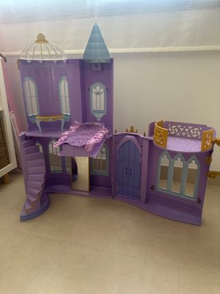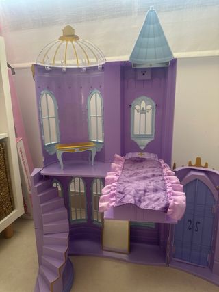 Questo castello giocattolo è di colore viola e ha un design ispirato a un palazzo da fiaba. Include un letto, scale, diverse finestre e una porta. Presenta una torre con cupola.