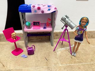 Set di gioco Barbie Descubrimiento Espacial con bambola Stacie. Include bambola Stacie con accessori. Letto a castello con scrivania e accessori per lo studio. Telescopio per osservare le stelle. Accessori aggiuntivi come zaino e scarpe da ginnastica.