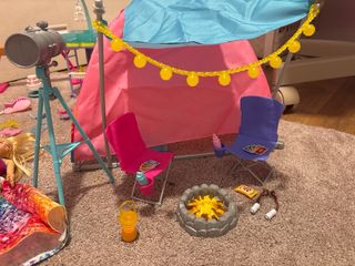 Set di bambole Melli e Zos, parte della famiglia Barbie Heart. Include due bambole gemelle. - Due letti a castello, uno rosa e uno blu. - Abbigliamento vario per Melli e Zos - Accessori per il campeggio familiare