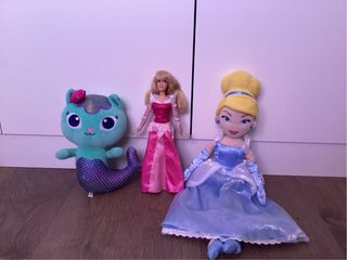 Set di bambole principesse Disney. Include bambola di Rapunzel in tessuto, bambola di Tiana, castello giocattolo Playmobil, bambola Yasmine, bambola Aurora Bella Addormentata, peluche Gabigato, bambola Cenerentola in tessuto. Bambole in tessuto a 15€ ciascuna, principesse tipo Barbie a 12€ ciascuna, castello a 12€. Si vende il set o separatamente.
