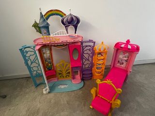 Fantastico castello da principessa per giocare con le bambole. Struttura in plastica nei toni del rosa e del blu. Include accessori come altalena e balcone. Contiene bambola Barbie con vestito blu.