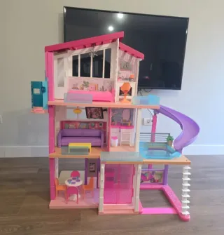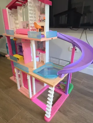 Casa dei Sogni Barbie. - Include scivolo viola. - Piscina blu. - Scala bianca. - Mobili interni come divano viola che diventa letto a castello, tavolo con sedie e stoviglie, bagno e accessori, appendiabiti, TV... Consegnata montata. Senza scatola. Misure: 120 alto x 107 largo (126 con scivolo) x 36 profondo