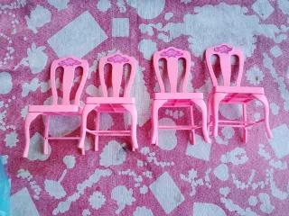 Set da gioco Barbie con tavolo e sedie in plastica rosa. - Tavolo ovale con specchio dorato. - Due sedie con decorazioni floreali. - Due sedie aggiuntive laterali.