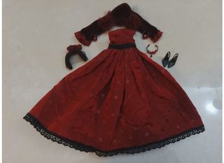 Bellissimo vestito vintage per Barbie, della Integrity Toys. Perfetto per collezionisti o amanti delle bambole. - Vestito rosso e oro, elegante e raffinato. - Accessori inclusi: borsa, fiocco testa, scarpe, orecchini no doll