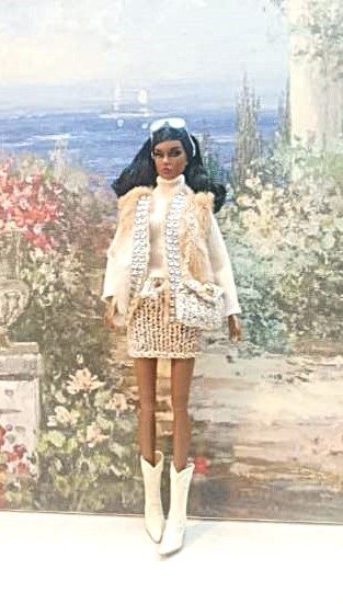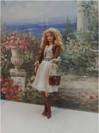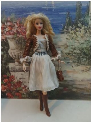 Completo outfit per bambola Barbie, compatibile anche con Integrity Toys. - Vestito bianco plissettato - Giacca marrone lavorata a mano - Cintura decorata - Borsa marrone - Stivali alti marroni
