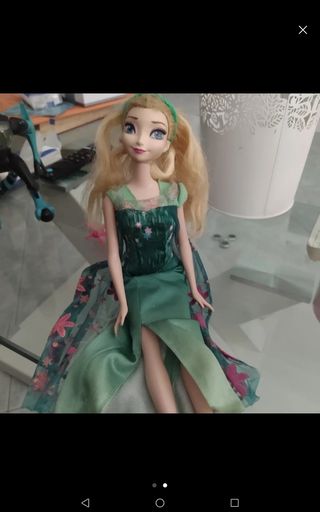 Bambola ispirata al personaggio di Frozen. - Vestito verde con decorazioni floreali. - Capelli biondi lunghi.