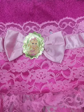 Bellissimo vestito rosa Barbie, perfetto per feste o carnevale. Presenta dettagli scintillanti e un fiocco decorativo. - Corpetto in pizzo e tessuto glitterato. - Gonna in tulle con ricami. - Fiocco frontale con medaglione.