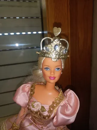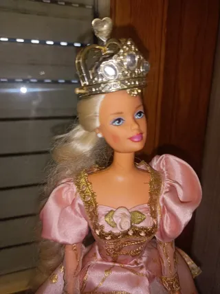 Bambola Barbie Rapunzel con un bellissimo abito rosa e corona. - Abito in raso rosa con dettagli dorati. - Corona dorata con pietre decorative. - Dettaglio floreale sul vestito.