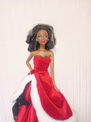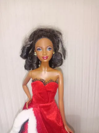 Bambola Barbie con un elegante vestito rosso. - Vestito rosso senza spalline con dettagli in pizzo nero. - Dettagli in pelliccia bianca. - Orecchini dorati.