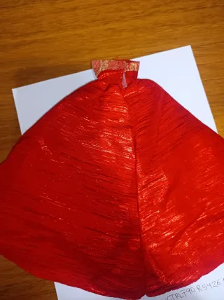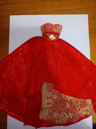 Splendido abito per Barbie, perfetto per occasioni speciali. - Colore rosso brillante con dettagli dorati. - Tessuto scintillante e pizzo. - Design elegante senza spalline.