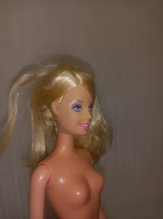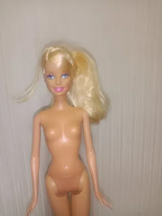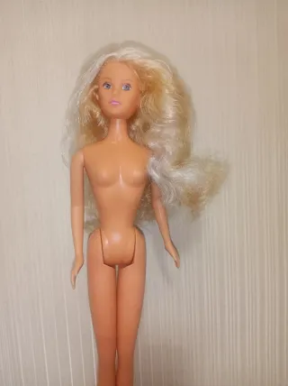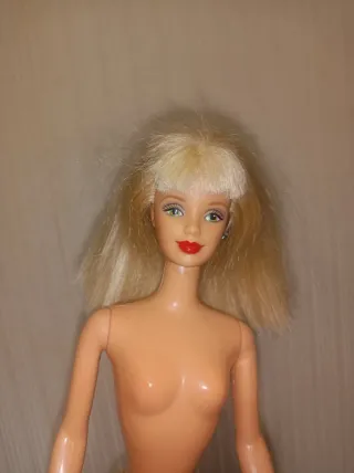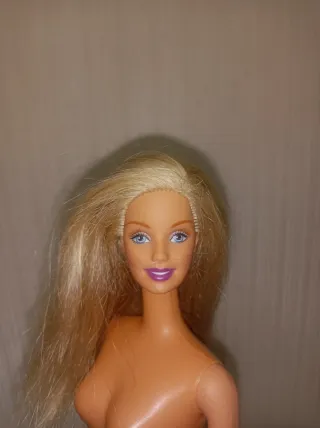 Bambola Barbie bionda. - Capelli biondi lunghi. - Trucco con labbra rosa e occhi azzurri. - Indossa un costume da bagno color carne.