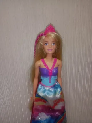 Bambola Barbie con un vestito colorato e una corona. - Vestito con corpetto viola e gonna arcobaleno. - Corona rosa. - Capelli biondi lunghi.